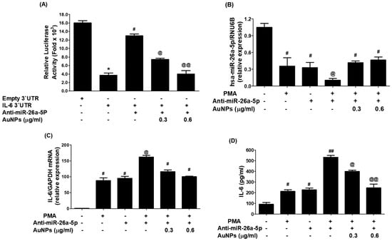 Gold nanoparticles (GNP) have gained considerable attention in medical applications due to their unique physicochemical properties and biocompatibility. These nanoscale particles, typically ranging from 1 to 100 nanometers in size, exhibit excellent stability, high surface area-to-volume ratio, and tunable optical properties [,]. GNP can be easily functionalized with various molecules, making them versatile platforms for targeted drug delivery, imaging, and therapy [,]. In the field of cancer treatment, GNP have shown promise as vehicles for delivering chemotherapeutic drugs directly to tumor cells, enhancing drug efficacy while minimizing off-target effects [,]. Additionally, GNP can serve as contrast agents for various imaging techniques, including computed tomography (CT), magnetic resonance imaging (MRI), and photoacoustic imaging, providing real-time visualization of tumors and facilitating accurate diagnosis and monitoring of treatment response [,,,]. Furthermore, GNP can be utilized in photothermal therapy, where they convert absorbed light energy into heat, selectively ablating cancer cells while sparing healthy tissue [,]. With ongoing research and advancements, gold nanoparticles hold great potential as therapeutics and imaging agents in a wide range of medical applications, offering opportunities for personalized and precise treatments in the future [,]. In this study, we proposed, for the first time, that GNP have the ability to suppress the over-secretion of IL-6 through modulation mediated by miRNAs. To investigate this hypothesis, we synthesized and characterized GNP using various parameters such as zeta potential, polydispersity index, and surface plasmon resonance. We utilized bioinformatics predictions to identify a potential binding site for miR-26a-5p in the 3′ untranslated region (3′UTR) of IL-6 mRNA. To quantify the expression of miRNAs and mRNA, we employed real-time PCR assays, while sandwich ELISAs were used to measure protein secretion in the cell culture supernatant. The obtained data were further validated using luciferase reporter clone assays and transfection with anti-miRNAs. Our novel findings provided evidence that chemically synthesized GNP were not only safe but also showed therapeutic potential against the overexpression of IL-6 and the overactivation of NF-κBp65/p50 transcription activity in MCF-7 cells activated with phorbol-12-myristate-13-acetate (PMA). These findings pave the way for the development of GNP as a promising therapeutic approach to target IL-6 over-secretion.