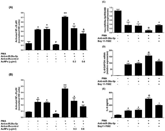 GNP suppressed PMA-increased RelA and NF-κBp50 activation through miR-26a-5p. (A) GNP suppressed PMA-increased RelA activation. (B) GNP suppressed PMA-activated NF-κBp50 in BC cells. (C) Bay 11-7082 increased miR-26a-5p in anti-miR-26a-5p-transfected cancer cells treated with PMA. (D) Bay 11-7082 suppressed IL-6 mRNA in anti-miR-26a-5p-transfected cancer cells treated with PMA. (E) Bay 11-7082 suppressed IL-6 induction in the culture supernatant of anti-miR-26a-5p-transfected cancer cells activated with PMA. Bars with different symbols are statistically significant, p < 0.05.