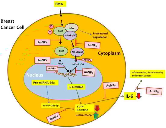 Therapeutic illustration of GNP potential against IL-6 induced inflammation, autoimmunity and BC. PMA activates RelA and NF-κB50 mediated signaling to IL-6 via miR-26a-5p. The figure systematically illustrates all the potential targets through which GNP can inhibit IL-6. The NF-κB complex, consisting of RelA and NF-κB50 subunits, is depicted, while the pathways indicated by broken arrows were not investigated. The abbreviations used are GNP for gold nanoparticles, PMA for phorbol-12-myristate-13-acetate, NF-κB for nuclear transcription factor-kappa B, and IL-6 for interleukin-6.