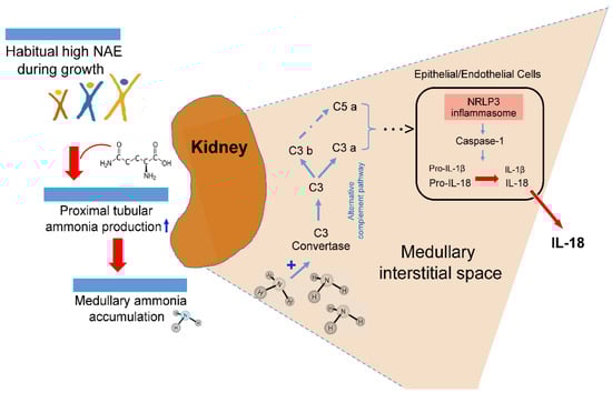 One cause of kidney-related inflammatory processes is acidosis. Acidosis-induced elevation of intrarenal ammoniagenesis can, partly via complement activation [], stimulate secretion of pro-inflammatory cytokines including IL-1β and IL-18 [,,].