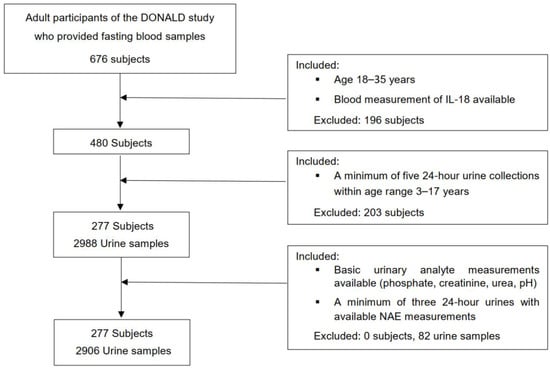 For this exclusively biomarker-based examination, an initial number of 573 participants of the DONALD study were considered, in whom a minimum of 5 eligible 24 h urine collections were available during growth, at least 2 within childhood (3–8 y) and at least 3 within adolescence (9–17 y). Those participants who had at least five 24 h urines with completed measurements of urinary pH, PO4, creatinine, and urea nitrogen, and a minimum of three 24 h urines with completed NAE measurements between age 3 and 17 years were further selected (n = 521). Finally, out of 521 participants, 277 individuals could be included in whom, also during adulthood (18–35 y), measurements of circulating IL-18 had been performed (Figure 1). In the case of more than one accomplished IL-18 blood measurements of participants (n = 41) being available, the respective IL-18 value of the last blood collection within age range 18 to 35 years was selected (Figure 2).