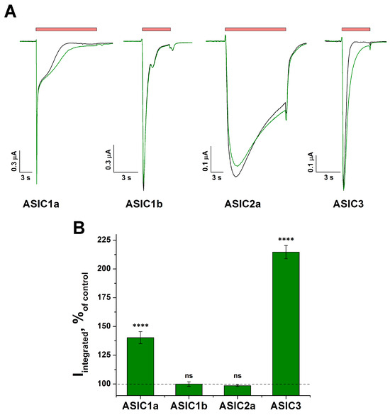 Effect of tafalgin (Taf) on the rat homomeric ASIC isoforms. (A) Representative current traces demonstrating the effect of 0.3 mM Taf (green line) on channels’ response to the pH 5.5 activating stimulus (red bar). (B) Bar plot of the integral current expressed as a percentage of the corresponding control currents (n = 5). The holding potential (Vh) was −50 mV. Data are presented as mean ± SEM; ns, non-significant, **** p < 0.001 vs. control, unpaired t-test.