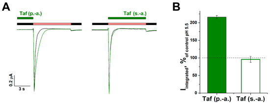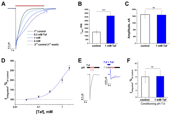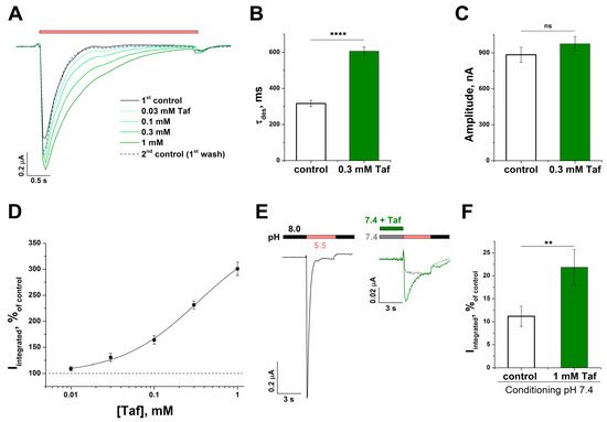 Taf (0.3 mM) did not have a significant effect on pHact50 (stimulating pH value, causing a 50% increase in the current) 6.48 ± 0.09 for control vs. 6.55 ± 0.06 for Taf, and nH of protons (2.5 ± 0.3 vs. 2.2 ± 0.2) (p = 0.5) (Figure 3E,F). Thus, Taf acted on the channel as a positive allosteric modulator and did not interfere with the interaction of protons with the channel.