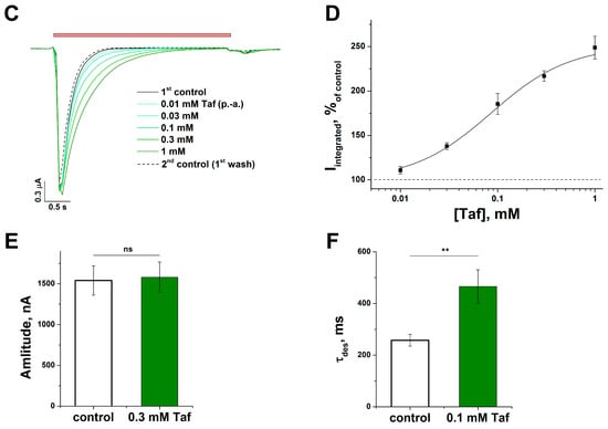 The modulating effect depended on the concentration of Taf that was applied in the range of 0.01–1 mM (Figure 2C). The integral current values were determined by the Hill equation, where the half-maximal effective concentration (EC50) was 0.086 ± 0.024 mM, the Hill coefficient (nH) was 1.08 ± 0.16, and the maximum current (Imax) was 251 ± 15% to control (pH drop from 7.4 to 5.5) (Figure 2D). It is worth noting that the current amplitude did not change (p = 0.9) (Figure 2E), while the rate of desensitization (τdes) increased significantly by 1.78 ± 0.12 times (258 ± 23 ms for control vs. 466 ± 65 ms for 0.1 mM Taf (p = 0.008)) (Figure 2F). In other words, the positive modulation occurred due to a decrease in the rate of desensitization (or an increase in the closure time) of the channel.