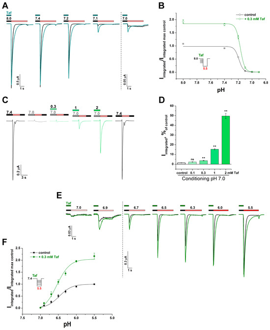 Taf influence on the rASIC3 pH dependence of the activation and the steady-state desensitization (SSD). (A) Representative current traces obtained from the same cell upon activation by a pH 5.5 stimulus (red bar) followed by pre-incubation with various conditioning pH either without (black line and black bar) or with 300 µM Taf (cyan line and cyan bar). (B) pH dependence of SSD either without or with 300 µM Taf (n = 5). (C) Representative current traces obtained from the same cell upon activation by a pH 5.5 stimulus (red bar) followed by pre-incubation with conditioning pH of 7.0 either without (gray line and grey bar) or with different Taf concentrations (green line and green bar). (D) Dependence of the integrated current to a pH 5.5 stimulus followed by a conditioning pH of 7.0 on the presence of Taf at various concentrations (n = 5). The response values are expressed as a percentage of the control value obtained at a conditioning pH of 7.4 and a stimulating pH of 5.5 (black lines on panel (C)). (E) Representative current traces obtained upon activation from conditioning pH of 7.4 (black bar) by various pH stimuli either without (black line) or with 300 µM Taf (green line and green bar). (F) pH dependence of activation with/without of 300 µM Taf (n = 9). Data are presented as mean ± SEM; ns, non-significant, ** p < 0.01 vs. control, Tukey’s test one-way ANOVA.