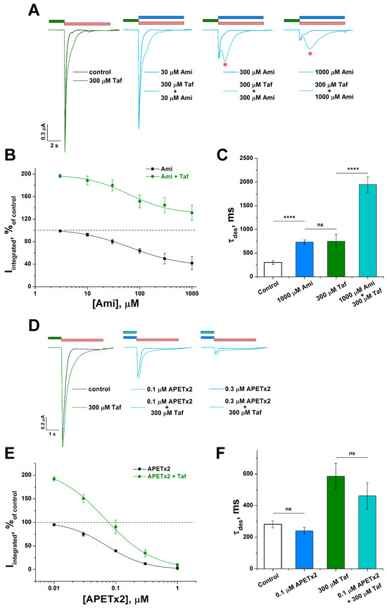 The well-known negative modulators of the ASIC3 channel in a competition experiment may help to localize the overlapped sites with the Taf binding site. We chose the low molecular weight compound amiloride (Ami) and the APETx2 peptide toxin as such negative modulators [20]. Ami inhibited the channel with calculated values of half-maximal inhibitory concentration (IC50) of 66.9 ± 5.2 µM (nH of 0.87 ± 0.05) (Figure 4A,B), which was in a good agreement with the data published [21]. The inhibition was incomplete, and the residual integral current (lower asymptote in Figure 4B) was 36 ± 2% of the control. In the presence of the 0.3 mM Taf, the IC50 and nH values were not significantly changed (61.5 ± 21.2 µM and 1.06 ± 0.37, respectively), but the residual current significantly increased up to 129 ± 9% (Figure 4B). The potentiating effect of both molecules exceeded the Taf effect as well. Therefore, we discovered an interesting synergistic effect realized via the development of the second current component (marked with a red asterisk in Figure 4A). The second component was especially pronounced at high Ami concentrations. The rate of desensitization of the second component was greatly slowed down, which was expressed as an increase in τdes by 6.8 ± 0.9 times relative to the control (302 ± 40 ms for control vs. 1947 ± 162 ms for 0.3 mM Taf with 1 mM Ami) (Figure 4C). It was of interest that the solo application of 1 mM Ami or 0.3 mM Taf increased τdes equally (up to 732 ± 46 ms for 1 mM Ami and 749 ± 143 ms for 0.3 mM Taf (p = 0.9)) and was significantly inferior to that of 0.3 mM Taf with 1 mM Ami (Figure 4C).