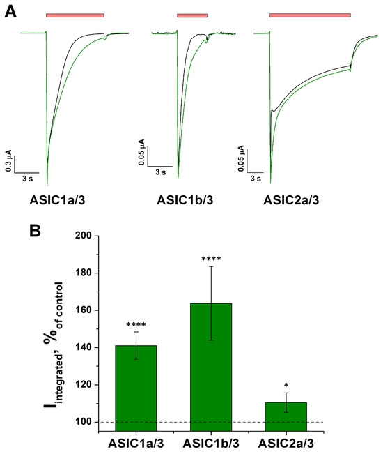 As was demonstrated above (Section 2.1), Taf had the strongest effect on ASIC3, whereas its effect on ASIC1b and ASIC2a was absent or insignificant. Therefore, we investigated how Taf acted on different heteromeric channels consisting of isoform 3 and another isoform: 1a, 1b, or 2a. A modulating effect of 0.3 mM Taf was observed for all three combinations (i.e., ASIC1a/3, 1b/3, and 2a/3 channels) (Figure 7A,B). Heteromeric ASIC1a/3 demonstrated an increase in current of 41 ± 7%, which absolutely coincided with the effect of Taf on the homomeric ASIC1a channels (Figure 1). The effect on the ASIC2a/3 heteromers was small but significant (increase in current by 10 ± 5% (p = 0.04)). Surprisingly, Taf had a strong modulating effect on ASIC1b/3, increasing the integral current by 64 ± 20%.