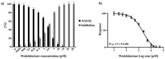 Experiments employing a wide range of WDL concentrations (ranging from 0 to 50 µM) were performed, and the titration of the molecule demonstrated 100% protease inhibition at 25 µM WDL. Using the titration data, the half-maximal inhibitory concentration (IC50) of WDL toward nsP2 was determined to be 2.3 ± 0.4 µM (Figure 1). This value is in the same range as previously reported flavonoids and small molecules targeting CHIKV nsP2: hesperetin (2.5 µM) and hesperidin (7.1 µM) [] and 1,3-thiazolbenzamide derivatives (between 8.3 and 13.1 µM) [].