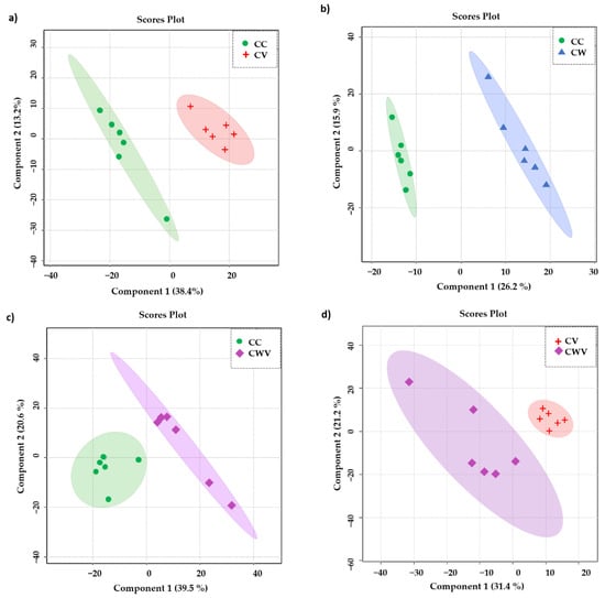 Principal component analyses (PCA) were performed for all spectra (all conditions, separately for data obtained by the noesygppr1d and cpmgpr1d pulse sequences) to explore intrinsic groupings within samples, reduce data dimensionality and identify outliers []. Partial least squares discriminant analysis (PLS-DA) models were generated to classify samples from the four conditions evaluated together and compared to the healthy control (CC) and identify the essential variables [,]. Model validation was assessed by leave-one-out cross validation (LOOCV) to evaluate its accuracy and performance, and variable of importance in projection (VIP) scores were analysed to identify the most different chemical shifts among samples. The validated models’ accuracy, specificity and sensitivity values were computed []. Univariate analysis was performed to confirm the discriminant metabolites identified by multivariate analysis (PLS-DA) between two conditions (CC × CV; CC × CW; CC × CWV; CV × CWV) and for visualisation of the relative metabolite levels between the groups, measured as peak intensities, using a t-test with p < 0.05 as the threshold for statistically significant difference.