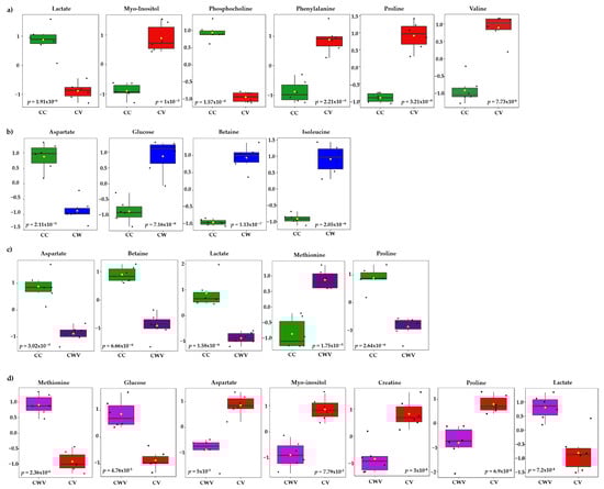 The most significant variables contributing to class discrimination in the PLS-DA models were identified through VIP graphs. Metabolites with VIP scores > 1.5 in the PLS-DA model (Figure S5) and p < 0.05 in the t-test were selected as differential metabolites. Box and whisker plots show relative concentrations for the most significantly altered metabolites (p < 0.05) in cell control (CC, green) and CV (red), CW (blue) and CWV (purple) (Figure 6). False discovery rate (FDR) estimates and the p-value threshold are presented in Tables S3–S6.