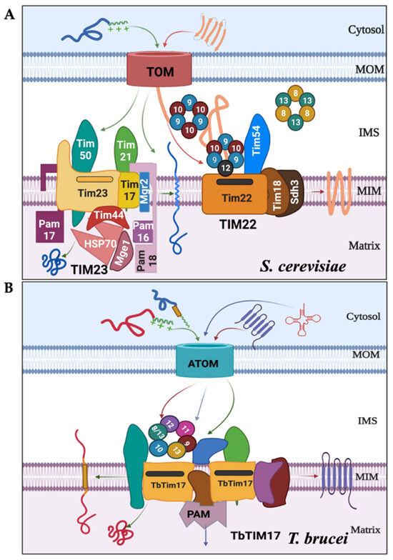 The major protein complexes involved in mitochondrial protein import differ between S. cerevisiae and T. brucei. (A) In fungi and mammals, after crossing the TOM complex, the N-terminal MTS-containing proteins are selected by the TIM23 complex and imported into the matrix with assistance from the presequence translocase-associated motor (PAM) complex. The internal signal-containing proteins are translocated via the TIM22 complex, with assistance from the small Tim complexes (Tim9–Tim10 and Tim8–Tim13) localized in the inter membrane space (IMS). (B) In T. brucei, both types of signal-containing proteins are transported via ATOM and then through the TbTIM17 complex consisting of TbTim17 and other trypanosome-specific Tims. The TbTIM17 complex consists of unique TbTims and the small TbTims: TbTim9, TbTim10, TbTim8/13, TbTim11, TbTim12, and TbTim13. The tentative import pathways for proteins with N-terminal (green arrows), internal targeting signals (red arrows), and tRNAs (blue arrows) are shown.