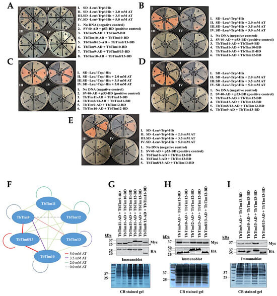 To confirm the expression of AD and BD fusion proteins with small TbTims in yeast, we grew co-transformants in SD (-leu, -tryp) liquid medium for 48 h. Subsequently, cells were harvested and total cellular proteins were analyzed via SDS-PAGE and immunoblot analysis using anti-Myc and anti-HA antibodies. We observed that each of these small TbTims fusion proteins were expressed at the expected size in the corresponding co-transfected yeast cells (Figure 2G–I). Duplicate Coomassie-stained gels served as our loading control. The expression levels for most of the fusion proteins were comparable in all transfectants, suggesting that differential interaction patterns are likely due to varying affinity among these pairs.