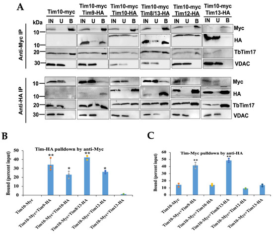 In a similar manner, when immunoprecipitating HA-tagged small TbTims from the corresponding samples, we observed that TbTim9-HA and TbTim8/13-HA co-precipitated a fraction of TbTim10-Myc (45% of the input). However, TbTim10-HA, TbTim12-HA, and TbTim13-HA precipitated less than 10% of TbTim10-Myc (Figure 3A, lower panel, and Figure 3C). This further indicates that the interactions of TbTim10 with TbTim9 and TbTim10 with TbTim8/13 are stronger compared to other small TbTims (Figure 3A,C). This also correlates with our Y2H results. The HA antibodies did not precipitate any protein from the mitochondrial extract that only had TbTim10-Myc. Similarly, TbTim17 was co-precipitated from all samples alike. As expected, VDAC was not precipitated by HA antibody from any samples. Due to some technical difficulties, we failed to generate a TbTim11-HA-expressing T. brucei cell line; therefore, we could not speculate on the association of this protein with other small TbTims.