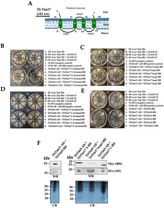 While it has been shown that the small TbTims are associated with the TbTIM17 complex [37,38], it remains unclear if they directly interact with TbTim17 and, if so, which regions of TbTim17 are involved. Similar to Tim17/22/23 family proteins, TbTim17 possesses four predicted transmembrane domains (TMs) (TMPred, a transmembrane prediction server) [43], with the N-terminal (1–30 AAs) and C-terminal (140–152 AAs) hydrophilic regions, along with loop-2 (93–102 AAs), the connecting region between TM2 and TM3, exposed in the IMS (Figure 4A) [44]. As small TbTims are localized in the IMS [37,38], we selected these regions of TbTim17 for testing their interactions with small TbTims through Y2H analysis, as described in the Materials and Methods. Yeast cells co-transformed with the N-terminal region of TbTim17, and individual small TbTim grew well up to 2.0 mM AT but reduced at 3.5 mM AT and showed significant hindrance at 5.0 mM AT (Figure 4B), indicating a weaker interaction. Yeast cells transformed with the TbTim17 loop-2 clone and individual small TbTim clones showed minimal growth even at 0 mM AT (Figure 4C). Only a mild growth was observed for the yeast cells transformed with the TbTim17 loop-2 and TbTim11 plasmids. The C-terminal region of TbTim17 strongly interacted with all small TbTims, with co-transformants growing well up to 5 mM AT (Figure 4D, Table 2). Direct interactions between the full length TbTim17 and small TbTims-BD were examined (Figure 4E). However, except for TbTim17 and TbTim12 (Figure 4E, pair 6) and TbTim17 and TbTim8/13 (Figure 4E, pair 8), which grew at 0 mM AT only (Figure 4E, Table 2), none of these small TbTims showed interactions with the full-length TbTim17, possibly due to improper folding of this hydrophobic protein.