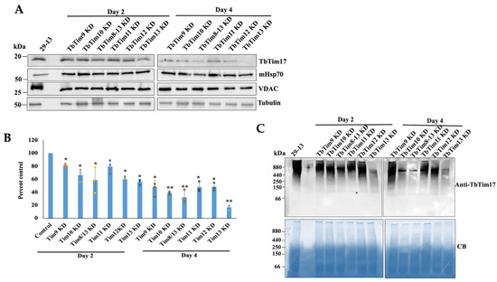 To assess if knockdown of any of these small TbTims has a stronger effect than others, we compared the levels of the TbTim17 and TbTIM17 complex in mitochondria isolated after each of these six small TbTims’ knockdowns in T. brucei, individually. The effects of the knockdown of TbTim9, TbTim10, and TbTim8/13 on cell growth and transcript levels were previously published [38]. Here, we show that TbTim11, TbTim12, and TbTim13 RNAi reduced the levels of the corresponding target transcript about 90%, 60%, and 90%, respectively, by 48 h post-induction (Figure S2A). We observed a significant growth inhibition of T. brucei cells due to the knockdown of TbTim11, TbTim12, or TbTim13, specifically at day 4 post-induction of RNAi and after (Figure S2B). Immunoblot analysis of the mitochondrial protein using the anti-TbTim17 antibody revealed that, at day 2 post-induction, TbTim17 levels were moderately reduced in all small TbTim RNAi samples; however, maximum reduction (~40%) was observed for TbTim13 RNAi (Figure 5A,B). This trend was continued at day 4 post-induction, with TbTim17 levels reduced below 20% of the parental control (Figure 5A,B) in TbTim13 knockdown mitochondria. At this time point, TbTim10 and TbTim8/13 knockdown also reduced TbTim17 levels to 40%, and knockdown of TbTim9, TbTim11, and TbTim12 reduced the levels of TbTim17 to 60–70%. RNAi for individual small TbTims affected VDAC levels similarly. In comparison to the control, mHsp70 levels increased due to knockdown of small TbTims, which could be a stress response phenomenon, since the small TbTims are essential for the T. brucei procyclic form; however, this needs to be further investigated. Small TbTims’ knockdown reduced VDAC levels, as we reported earlier, suggesting a role for the small TbTims in VDAC biogenesis (Figure 5A). Tubulin was used as a loading control (Figure 5A).