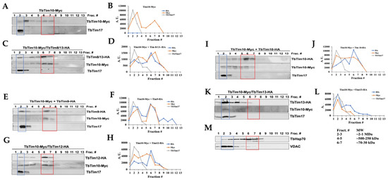 Analysis of the small TbTims complexes in T. brucei. Mitochondria isolated from the TbTim10-Myc, TbTim10-Myc/TbTim8/13-HA, TbTim10-Myc/TbTim9-HA, TbTim10-Myc/TbTim12-HA, TbTim10-Myc/TbTim10-HA, and TbTim10-Myc/TbTim13-HA T. brucei cells were solubilized with digitonin. The soluble supernatants were fractioned by SEC. Proteins were eluted with 1X Native buffer (20 mM Tris, pH 7.0, 50 mM NaCl, 1 mM EDTA, 10% glycerol, 1 mM PMSF, and 0.1% digitonin). (A,C,E,G,I,K) Fractions (1–13) were analyzed via SDS-PAGE and immunoblot analysis using HA and Myc antibodies. (M) mHSP70 and VDAC were used as standard mitochondrial proteins. Fraction numbers (Frac. #) are indicated at the top of the blot. Fractions 2 and 6–7 are in blue and red boxes, respectively. (B,D,F,H,J,L) Myc- and HA-tagged small TbTims and TbTim17 bands were quantitated via ImageJ software (version 1.53a, National Institute of Health, USA) for each run and plotted against the fraction numbers in Excel. Band intensity is presented in arbitrary units (A.U.). Runs from multiple experiments from each sample were reproducible.