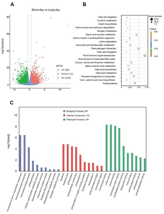 GO and KEGG enrichment analysis of differentially expressed genes in water spinach under short-day and long-day conditions: (A) volcano plot indicating the DEGs under short-day and long-day conditions; (B) KEGG pathway enrichment of photoperiod-related genes; (C) GO functional enrichment of photoperiod-related genes. Three main GO categories are summarized: BP, CC, and MF. BP, biological process; CC, cellular component; MF, molecular function. The number of DEGs is shown on the bar.