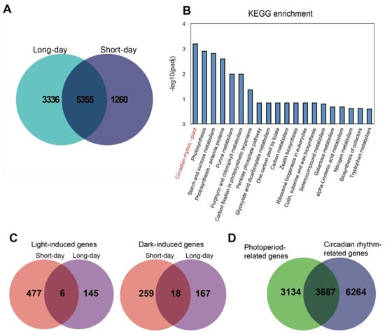 (A): Venn diagram representation of DEGs in long-day and short-day conditions; (B): KEGG enrichment analysis of 5355 circadian-rhythm-related genes; (C): Venn diagram representation of light-induced genes and dark-induced genes; (D): Venn diagram representation of photoperiod-related genes and circadian-rhythm-related genes.