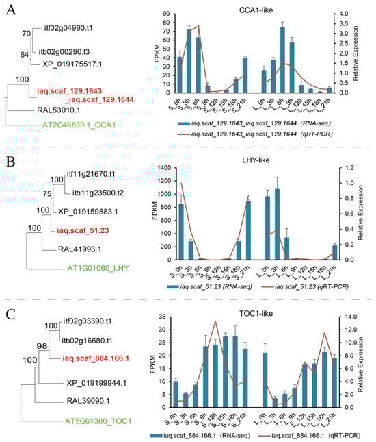 The transcriptome data revealed that the transcript level of iaq.scaf_884.166 (TOC1-like) began to rise after light, whereas the expression levels of iaq.scaf_51.23 (LHY-like) and iaq.scaf_129.1643_iaq.scaf_129.1644 (CCA1-like) gradually decreased. The transcription levels of Ziaq.scaf_51.23 (LHY-like) and iaq.scaf_129.1643_iaq.scaf_129.1644 (CCA1-like) were accompanied by a decrease in the iaq.scaf_884.166 (TOC1-like) expression level in the dark. These outcomes validated the negative regulatory effect of LHY/CCA1 on TOC1 []. In addition, LHY and CCA1 also regulate the transcription of GI and FKF1 genes []. In our work, there was a negative correlation between iaq.scaf_51.23 (LHY-like), iaq.scaf_129.1643_iaq.scaf_129.1644 (CCA1-like), and iaq.scaf_28.25 (GI-like) based on the transcription levels, which established that LHY/CCA1 inhibited the transcription of GI []. LHY/CCA1 accelerated flowering by promoting FT expression and reducing the abundance of SVP []. The TOP1 gene was highly expressed at night and suppressed the transcriptional levels of LUX, ELF4, and GI [], and the transcriptome data confirmed this result. It has been shown that there is a redundant function between the LHY and CCA1 genes []. In addition, the lack of CCA1 also affects the regulation of gene expression by phytochromes, suggesting that CCA1 has an independent function []. Recent research revealed that the expression of CCA1/LHY was regulated by Brassinosteroids (BRs) []. DET1, as an important core transcriptional repression factor, regulates the clock process by interacting with CCA1/LHY target genes []. CCA1 and LHY also have the function of coordinating Fe homeostasis in A. thaliana by directly regulating Fe metabolism and the transcription of transport genes [].