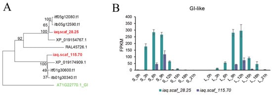 iaq.scaf_1261.31 and iaq.scaf_913.48 are FKFI-homologous genes; iaq.scaf_19.19 accumulated under both long-day and short-day conditions, and the transcription level was consistent. The expression progressively increased with the daylight hours, reaching a peak in the evening, and then the transcript level continuously declined in the dark, signifying a similar expression pattern to that of iaq.scaf_28.25 (IaGI). As a negative regulator of flowering, the transcript level of iaq.scaf_56.407 (IaCOP1) was opposite to those of the IaGI and IaFPK1 genes: the transcript level decreased continuously during the day, and the expression level gradually accumulated after dark (Figure S1).
