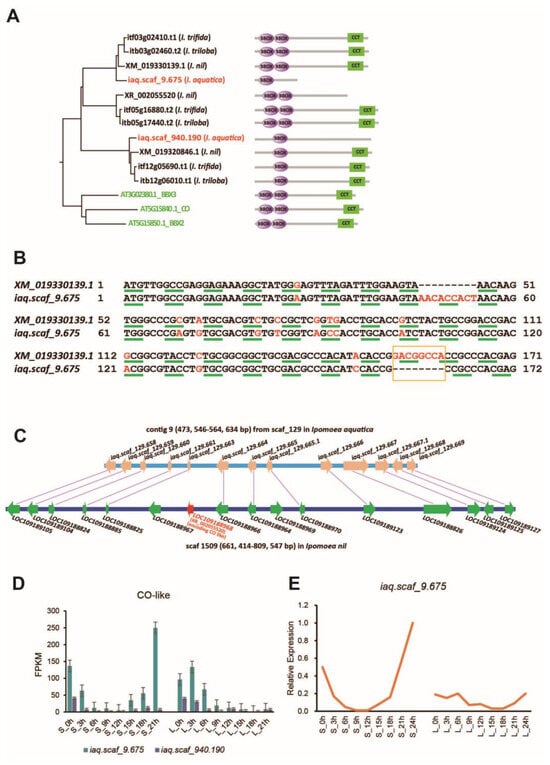 (A): Phylogenetic analysis and domain prediction of the CO subgroup members; (B): alignment of iaq.scaf_9.675 (IaCO1) and its ortholog XM_019330139.1; (C): synteny analysis between water spinach orthologs and the I. nil genome containing XR_002055520 encoding CO-like; (D): transcript level of CO-like genes in water spinach; (E): relative expression of iaq.scaf_9.675. S indicates short day; L indicates long day.
