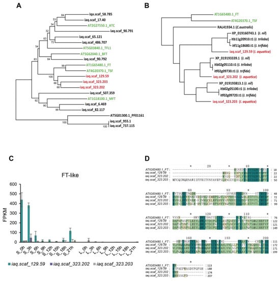 The A. thaliana FT/FTL1 gene family contains 6 genes, and the family is expanded to 12 members with 3 FT subgroup members in water spinach (iaq.scaf_129.59 (IaFT1), iaq.scaf_323.202, and iaq.scaf_323.203). During the long day, almost no transcripts were detected for any members in the leaves. During the short day, only the FT subgroup members were strongly up-regulated (Figure 7). The expression of the iaq.scaf_129.59 gene was significantly higher than the others, and its expression gradually decreased with the increase in daylight time and then gradually increased after darkness, reaching the peak in the early morning. These results suggest that iaq.scaf_129.59 is an ortholog of FT (Figure 7C). The loss of expression of iaq.scaf_129.59 could be the cause of the complete inhibition of the flowering ability of water spinach under the long day length.