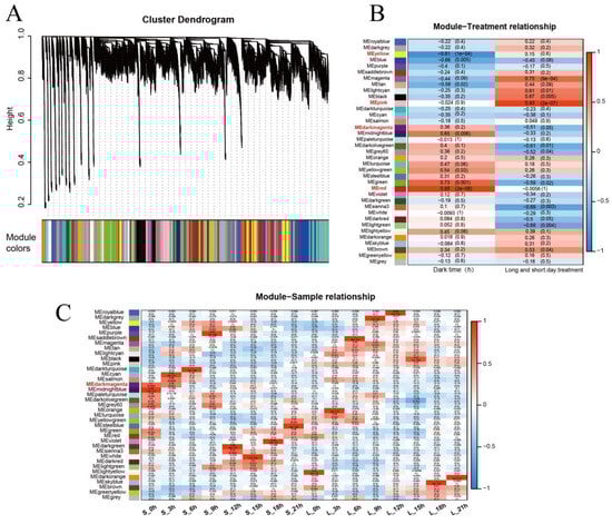 Gene co-expression network analysis by WGCNA (A): hierarchical cluster of 37 modules of co-expressed genes; (B): module–trait relationship heatmap for different traits and modules; (C): module–sample relationship heatmap. S indicates short day; L indicates long day.
