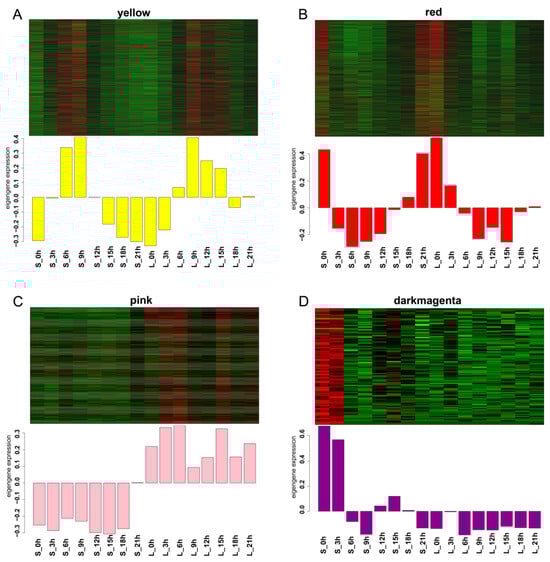 Heatmap of genes in the four modules. (A): Yellow module; (B): red module; (C): pink module; (D): dark-magenta module. S indicates short day; L indicates long day.