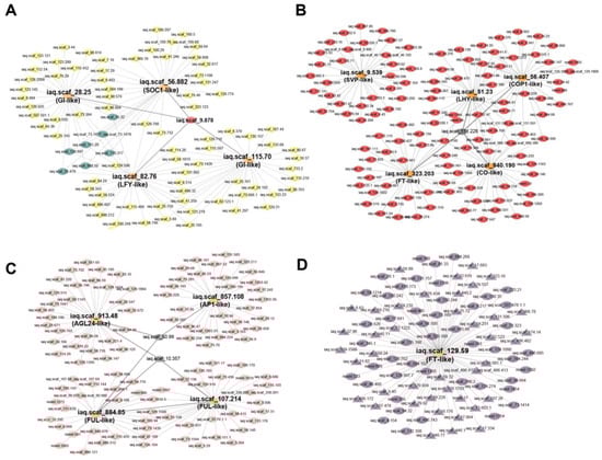 There are some flowering-associated genes in these four modules: iaq.scaf_28.25 (GI-like), iaq.scaf_115.70 (GI-like), iaq.scaf_82.76 (LFY-like), and iaq.scaf_56.882 (SOC1-like) in the yellow module; iaq.scaf_56.407 (COP1-like), iaq.scaf_9.539 (SVP-like), iaq.scaf_51.23 (LHY-like), iaq.scaf_323.203 (FT-like), and iaq.scaf_940.190 (CO-like) in the red module; iaq.scaf_913.48 (AGL24-like), iaq.scaf_857.108 (AP1-like), iaq.scaf_107.214 (FUL-like), and iaq.scaf_884.85 (FUL-like) in the pink module; and the iaq.scaf_129.59 (FT-like) gene in the dark-magenta module. To further determine the relationships between flowering-associated genes in the four modules, correlation networks were constructed.