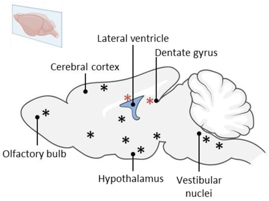 The discovery of neural stem cells has actually revolutionized our understanding of brain plasticity, enabling us to better decipher the intimate mechanisms of brain development and the cellular and molecular events correlated with neuropathologies. These cells are primarily located in specialized regions of the brain, called neurogenic niches, such as the subgranular zone of the dentate gyrus and the subventricular zone of the lateral ventricles. However, other brain regions such as the hypothalamus [,,] and the vestibular nuclei [] have subsequently been discovered with a pool of neural stem cells.