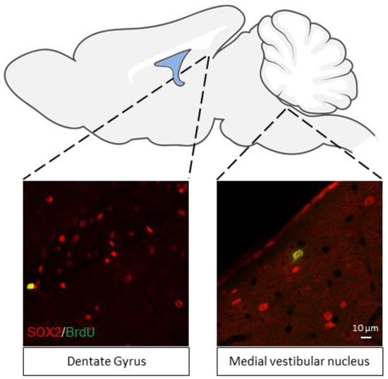 Graphical representation of the rodent brain with a particular focus on the classical neurogenic niche SGZ of the dentate gyrus and the medial vestibular nucleus (MVN). Proliferative neural stem cells (SOX2+/BrdU+) and quiescent neural stem cells are found in both the SGZ and the MVN. Adapted from [].