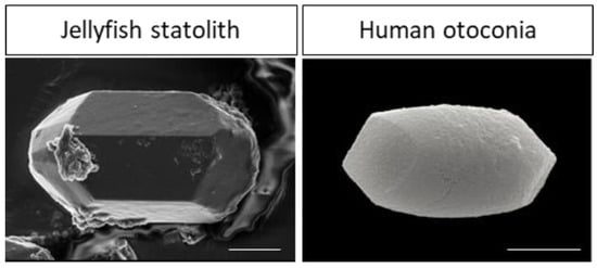 Scanning electron micrographs of statolith from Sanderia malayensis (Scyphozoa) and human otoconia. Scale bar = 5 µm. Note that human otoconia and jellyfish statoliths have a similar crystal-shaped appearance. Adapted from [] for the human otoconia and the statolith micrograph is a generous gift from Dr. Ilka Sötje from University of Hamburg. Scale bar = 5 µm.