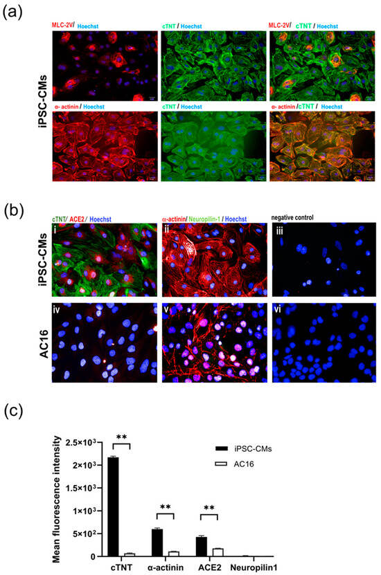 Characterization of cultured cardiac myocytes. (a) Expression of cardiac markers in iPSC-CMs. Differentiated myocytes (>day20) were stained for expression of cardiac trophoninT (green), α-actinin (red) and MLC2V (red), respectively. (b) Expression of SARS-CoV-2 host receptors in iPSC-CMs (i–iii) and AC16 myocytes (iv–vi). Differentiated myocytes (>Day20) and AC16 cells were stained for expression of SARS-CoV-2 host cell markers ACE2 (red) and neurophilin-1 (green). Nuclei were counterstained with Hoechst 33342 (blue). Cells without primary antibodies were used as controls. Scale bar 50 µm. (c) Mean fluorescence intensity of cardiac markers (cTNT, α-actinin) and SARS-CoV-2 host receptors (ACE2, neuropilin-1) in iPSC-CM and AC16 cells. Statistical significance was analyzed using independent Student’s t-tests. p value < 0.01 was considered significant (**).