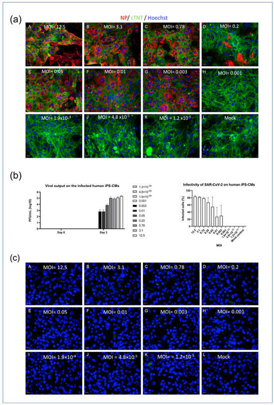To investigate the infectivity of SARS-CoV-2 in different cell types, an in vitro model was employed using myocytes (iPSC-CMs and AC16 cells). The cells were seeded in 96-well plates and exposed to varying concentrations of the SARS-CoV-2 virus, indicated by MOI (multiplicity of infection) values ranging from 1.2 × 10−5 to 12.5. Immunofluorescence detection of the nucleocapsid protein (NP) was used to visualize viral infection within the cells, and a viral plaque assay was used to quantify the concentration of viral output at different MOIs. The iPSC-CMs displayed susceptibility to SARS-CoV-2 infection at MOI levels above 0.001, which was demonstrated by the presence of NP and viral loads detected through immunofluorescence staining and plaque assays, as depicted in Figure 2a,b. The higher the MOI level, the greater the observed viral infection within the iPSC-CMs. In contrast, the AC16 cardiomyocytes exhibited no signal of NP post infection (Figure 2c). This lack of NP detection is consistent with previous experiments that demonstrated the absence of viral receptors on the surfaces of AC16 cells. These findings suggest a differential susceptibility to SARS-CoV-2 infection between iPSC-CMs and AC16 cells, indicating that the cellular context plays a crucial role in the infectivity of the virus.