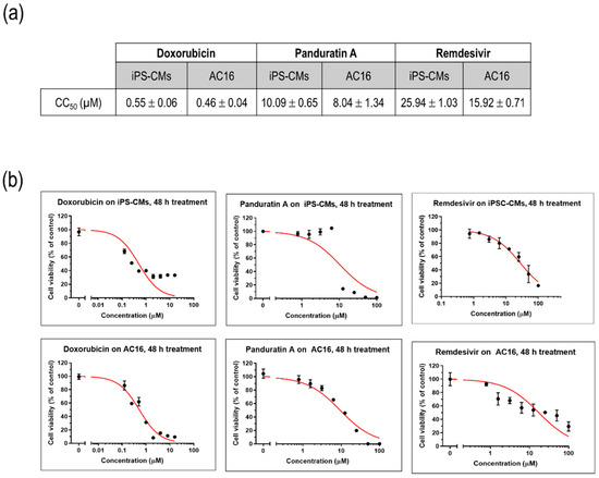 To assess the impact of various compounds on the viability of cultured myocytes, iPSC-CMs and AC16 cells were treated with different concentrations of doxorubicin, a well-known cardiotoxic compound, as well as remdesivir, an antiviral agent commonly used in the treatment of SARS-CoV-2. A plant-derived phytochemical panduratin A (pan A), was included in the evaluation for its potential toxicity effects. After 48 h of treatment, the viability of the cells was assessed by measuring their metabolic activity using the MTT assay. The CC50 values, which represent the concentration of a compound that reduces the cell viability by 50%, were determined. Specifically, the CC50 value for doxorubicin was found to be 0.55 µM, indicating its significant toxicity towards iPSC-CMs. In comparison, the CC50 value for remdesivir was 25.94 µM, suggesting a relatively higher tolerance of iPSC-CMs to this antiviral agent, while panA displayed a higher toxicity with a CC50 value of 10.09 µM (Figure 3a,b).