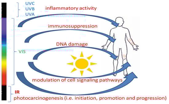The effect of exposure to intense optical radiation (ultraviolet > visible light > infrared) is to excite electrons in the tissue, resulting in heating or burns. Due to the low penetrability of optical radiation, the effects mainly affect surface tissues, i.e., the retina and skin [2,3]. While infrared radiation energy can be used in therapeutics due to its beneficial effects, especially on connective tissue reconstruction and vitamin D synthesis (eustress) by activating 7-dehydrocholesterol, the photochemical effects of ultraviolet (400 nm–1 nm, 1015–1017 Hz, UVR) are detrimental. Excessive, long-term exposure to UVR can cause eye diseases (cataracts, retinal degeneration), skin dysfunctions in the form of burns, photoaging, skin cancer, and even systemic effects in the form of a weakened immune system. It is not only UVR that is dangerous. It turns out that free radicals are formed in the skin after exposure to a wide range of wavelengths, from UVB (280 nm) through VIS (700 nm) to near-infrared (NIR), both in vivo and ex vivo [4,5]. Visible light has been shown to be responsible for about half of the total oxidative load on the skin [6]. High doses of infrared radiation also cause the formation of reactive singlet oxygen and hydroxyl radicals in human skin [7]. Photodamage to the skin results primarily from the occurrence of chronic inflammation, immunosuppression, and photocarcinogenesis (Figure 1).