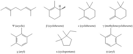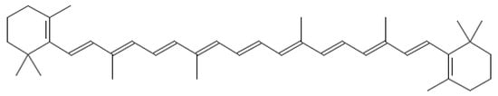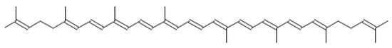 From a chemical point of view, carotenoids are tetraterpene compounds mostly composed of several isoprene units. There are usually nine conjugated double bonds in the end-group terminated carbon skeleton (Figure 6) [108], C-40, C-45, or C-50 in the case of higher carotenoids, or C < 40 in the case of apocarotenoids. Carotenoids are basically divided into two groups, i.e., carotenes, which are hydrocarbons, and xanthophylls containing oxygen atoms, which can come from various functional groups, i.e., –OH (hydroxyl), =CO (carbonyl), –CHO (aldehyde), –COOH (carboxyl), epoxy, and furanoxide [109].