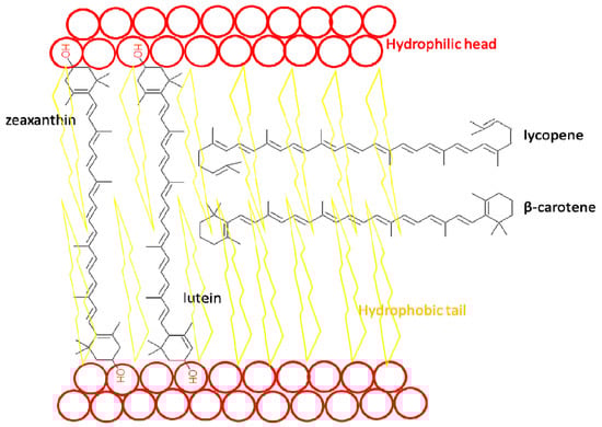 Carotenoids accumulate in the epidermis and dermis, so they play an important role in the skin’s antioxidant defense. Due to their significant lipophilicity, they localize within cell membranes. Inside the lipid bilayer, carotenoids assume different spatial orientations (Figure 7). While β-carotene and lycopene are arranged along the membrane, more polar molecules containing oxygen atoms, such as lutein and zeaxanthin, are perpendicular to the membrane surface [147].