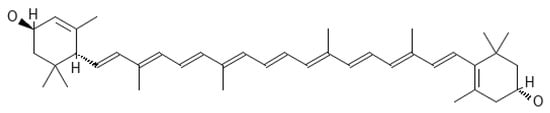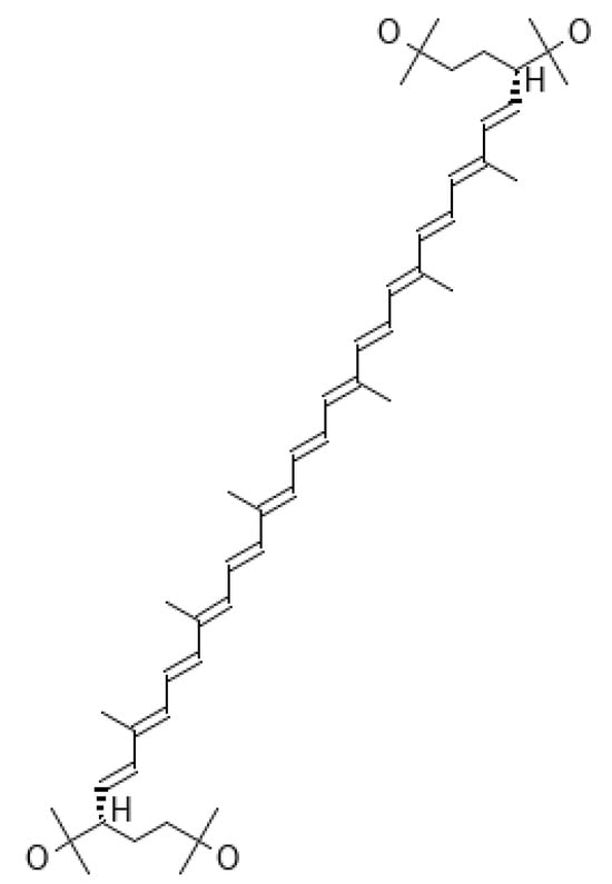 Astaxanthin (AST 3,3′-dihydroxy-β,β-carotene-4,4′-dione) (Figure 10) is an oxygen derivative of carotenes, a fat-soluble pigment that contains 13 conjugated double bonds.