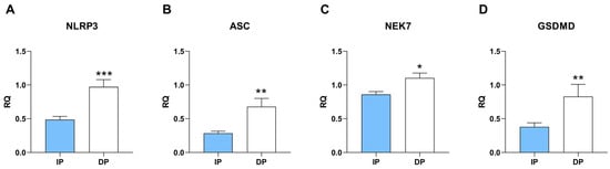 Quantitative RT-PCR gene expression was performed using StepOnePlus (Applied Biosystems, MA, USA) and following the TB Green Premix Ex Taq II (Tli RNaseH Plus) (RR820A, Takara Bio Inc., Shiga, Japan) manufacturer’s protocol. The expression of six candidate genes was evaluated: NLRP3, ASC, NEK7, GSDMD, MYH2 (myosin type 2A), and MYH3 (myosin type 3). HPRT1 gene expression was used as endogenous control. Specific primers to each gene were designed by our laboratory and its sequences and references can be found in Supplementary Table S4.