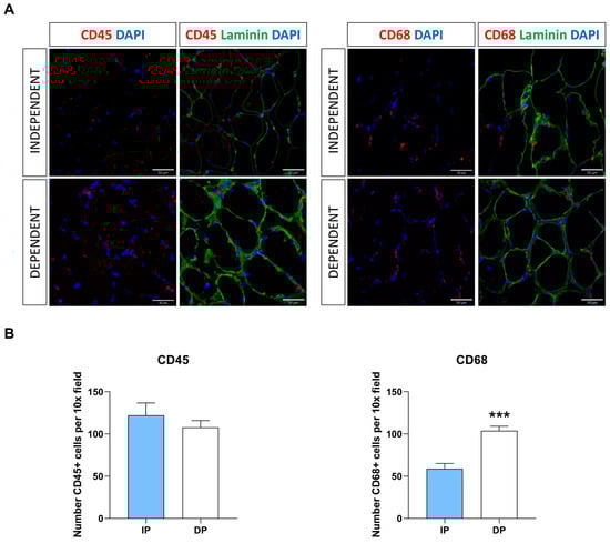 Increase in infiltrated immune cells in sarcopenic muscle from DP. (A) Immunofluorescence staining of skeletal muscle sections from independent- and dependent patients for CD45 and CD68. (B) Quantification of CD45+- and CD68+-cells in independent and dependent patients (n = 5 for each of the two groups). *** p ≤ 0.001.