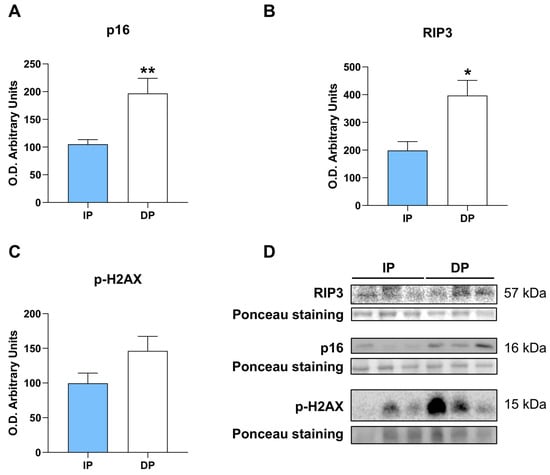 Moreover, DNA damage response was analyzed and revealed higher although no significant levels of H2AX phosphorylation in sarcopenic muscle from DP (Figure 5C), suggesting higher oxidative stress and DNA damage, and corroborating the increase in cellular senescence upon severe skeletal muscle loss.