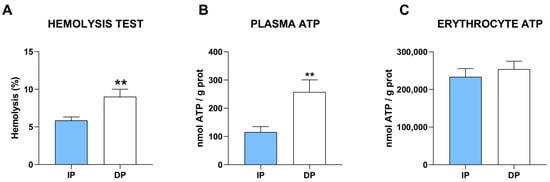 Plasma and erythrocytes ATP levels were evaluated using the ATP Bioluminescent Assay Kit (FLAA, Sigma-Aldrich, Burlington, MA, USA). ATP measurement is based on its consumption when firefly luciferase catalyzes the oxidation of D-luciferin. The assay was assessed following the manufacturer’s recommendation and ATP content was determined by the light emission enhanced by the oxidation reaction using SIRIUS luminometer (Berthold, Pforzheim, Germany).