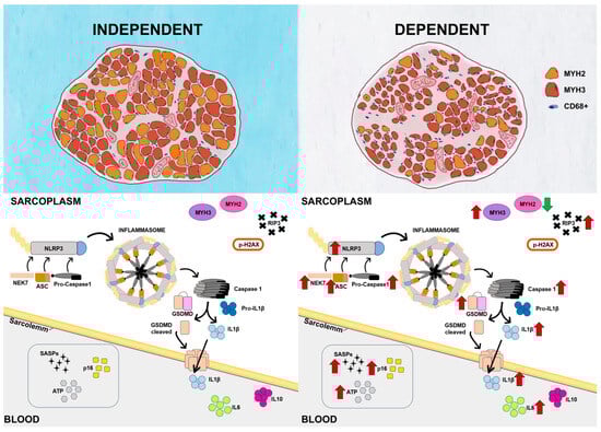 Inflammaging, an enduring condition of inflammation distinguished by increased levels of inflammatory markers in the blood, is closely linked to various age-related ailments such as sarcopenia []. This chronic inflammation not only increases the risk of chronic diseases but also contributes to disability and frailty in individuals. Senescence-associated secretory phenotype (SASP) constitutes a maladaptive response driving to inflammaging, aging phenotypes, and pathologies late in life. The SASP factors can be divided into the following major categories: soluble signaling factors, which include interleukins, chemokines, and growth factors; secreted proteases and secreted insoluble proteins/extracellular matrix (ECM) components []. In this study, we found that individuals diagnosed with dependency exhibit a pro-inflammatory phenotype characterized by the increased expression of Caspase-1, IL-6, IL-1ß, as well as an elevation in the presence of CD68+ inflammatory cells. The senescence secretory profile plays a pivotal role in the initiation and advancement of various myopathies [,]. Additionally, we found high levels of protein expression of cell-cycle inhibitor p16INK4a indicating an increase in senescence cells in sarcopenic muscle from DP. In turn, p16 activates the NLRP3 inflammasome pathway by increasing integrin alpha L (ITGAL) and integrin alpha M (ITGAM) expression [] making a feedback loop [].