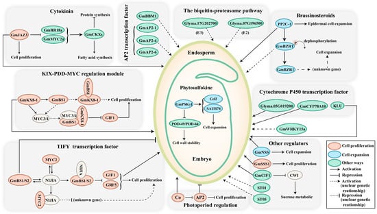 Nguyen et al. [] reported and characterized the GmKIX8-1, a gene that encodes a nuclear protein regulating organ size in soybeans. GmKIX8-1 encodes a conserved KIX domain protein that is homologous to AtKIX8 in A. thaliana, which limits organ growth by modulating cell proliferation in meristematic tissues []. Previous studies have revealed that the KIX-PPD-MYC-GIF1 module controls seed size in A. thaliana by inhibiting cell proliferation in the outer integument during the development of embryo sac and early seed [], this regulatory mechanism may also exist during seed development in soybean.