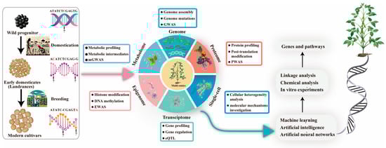 Recent high-throughput advances in genomics and other omics approaches have enhanced our understanding of genetic diversity. Integrating this data through AI and machine learning offers insights into the regulatory networks of key agricultural traits. Abbreviations: eQTL, expression qualitative trait locus; GWAS, genome-wide association study; EWAS, epigenome-wide association study; mGWAS, metabolite genome-wide association study; PWAS, proteome-wide analysis of SNPs; Single-cell, single-cell sequencing technology.