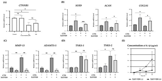 2.2. Effect of the TNKS-1/2 Inhibitor XAV939 on CTS-Induced Gene Expression and Concentration of IL-1β in the Supernatant in Normal Human Chondrocytes
