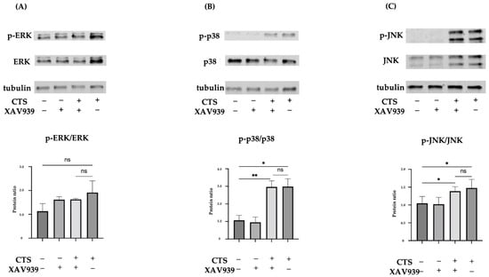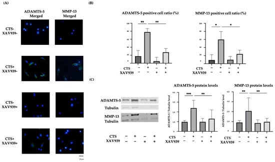 2.4. The TNKS-1/2 Inhibitor XAV939 Suppressed CTS-Induced ADAMTS-5 and MMP-13 Protein Expression in Normal Human Chondrocytes