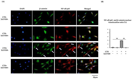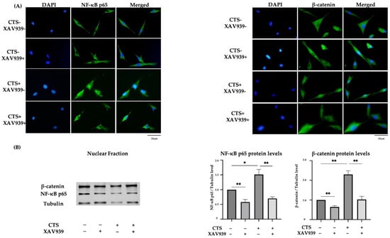2.5. Effect of XAV939 on CTS-Induced Nuclear Translocation of NF-κB p65 and β-Catenin in Normal Human Chondrocytes