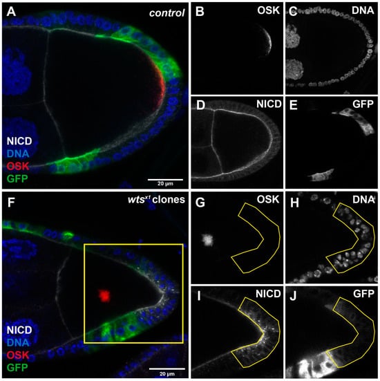 We used a mosaic analysis with a repressible cell marker (MARCM) technique [] to generate FRT/FLP mitotic clones of mutated cells with a loss of function (wtsx1) allele of wts. In control egg chambers, the OSK signal was localized in the crescent at the posterior side (Figure 1A,B), while single-layer follicle cells surrounded the germline cells (Figure 1C). The Notch intracellular domain (NICD) signal was observed at the apical part of the follicle cells (Figure 1A,D). The GFP signal indicated that the follicle cells expressed GFP but had no mutation (Figure 1E). In the wtsx1 egg chambers, when the posterior follicle cells were GFP-positive clones (wtsx1 clones) (Figure 1F,J), we observed that the OSK mis-localized to the middle of the oocyte (Figure 1G), and we also observed the over-proliferative phenotype (Figure 1H) and the accumulation of the NICD signal (Figure 1I). These results are consistent with those of previous studies [,]. We found that the signal of GFP in the wtsx1 PFCs was lower than other GFP-positive clones (Figure 1J), but the NICD signal accumulated in the wts-mutant PFCs. Hence, in order to mark the wtsx1 PFCs, we chose the NICD signal as a marker (the yellow line in Figure 1I). The over-proliferative phenotype is effectively framed by the yellow line (Figure 1H).